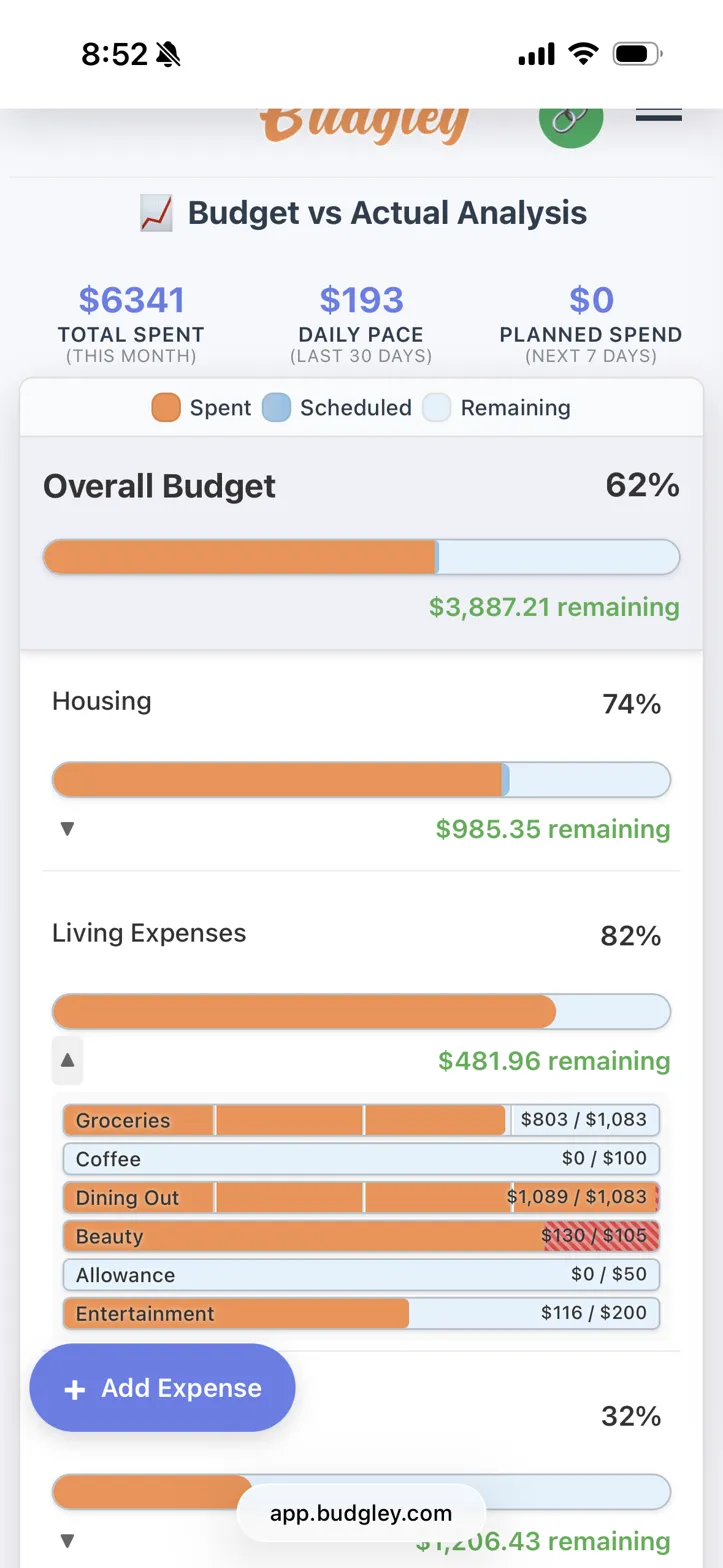 Log expenses from your phone in seconds. Budgley shows what's left in each category so you always know where you stand.